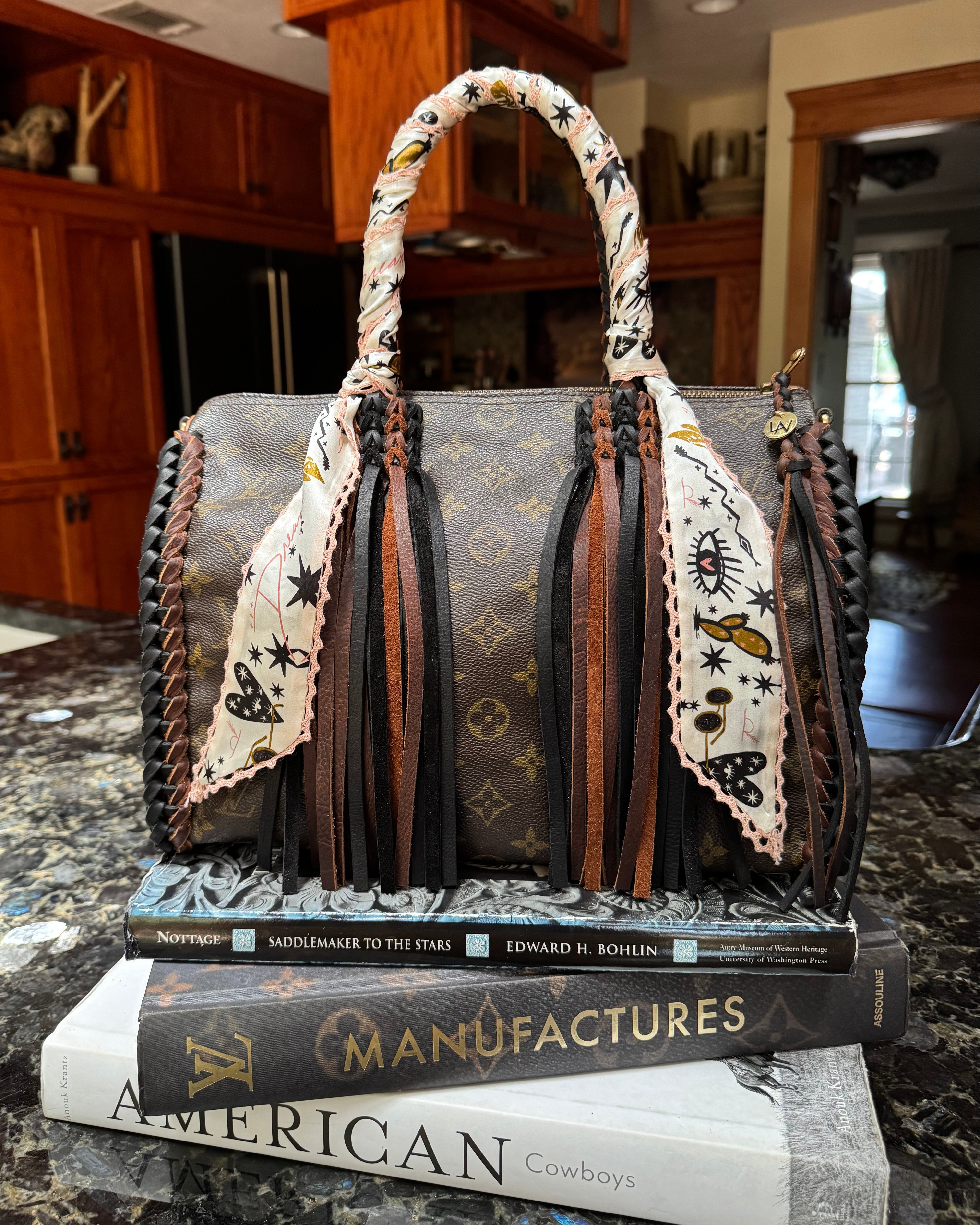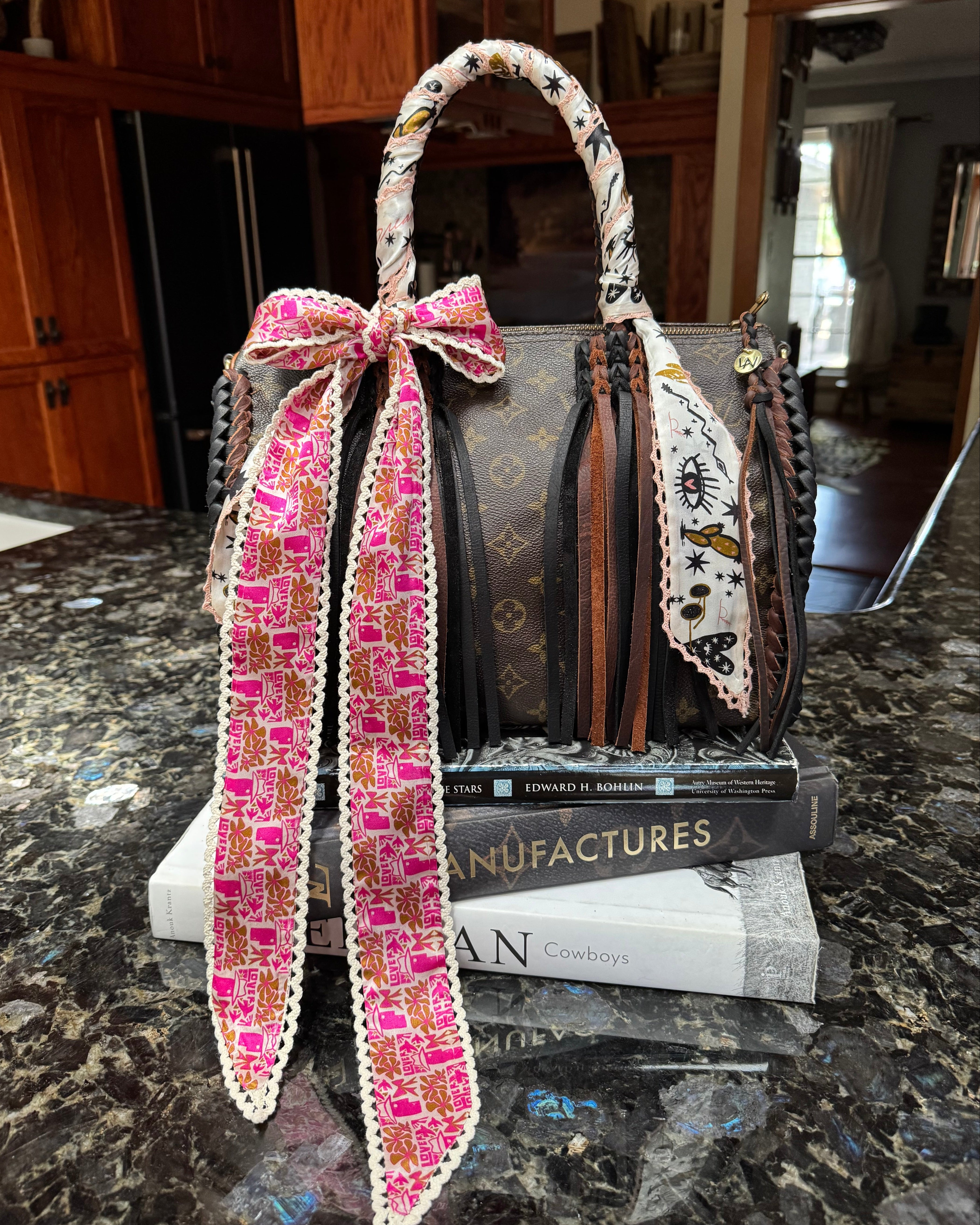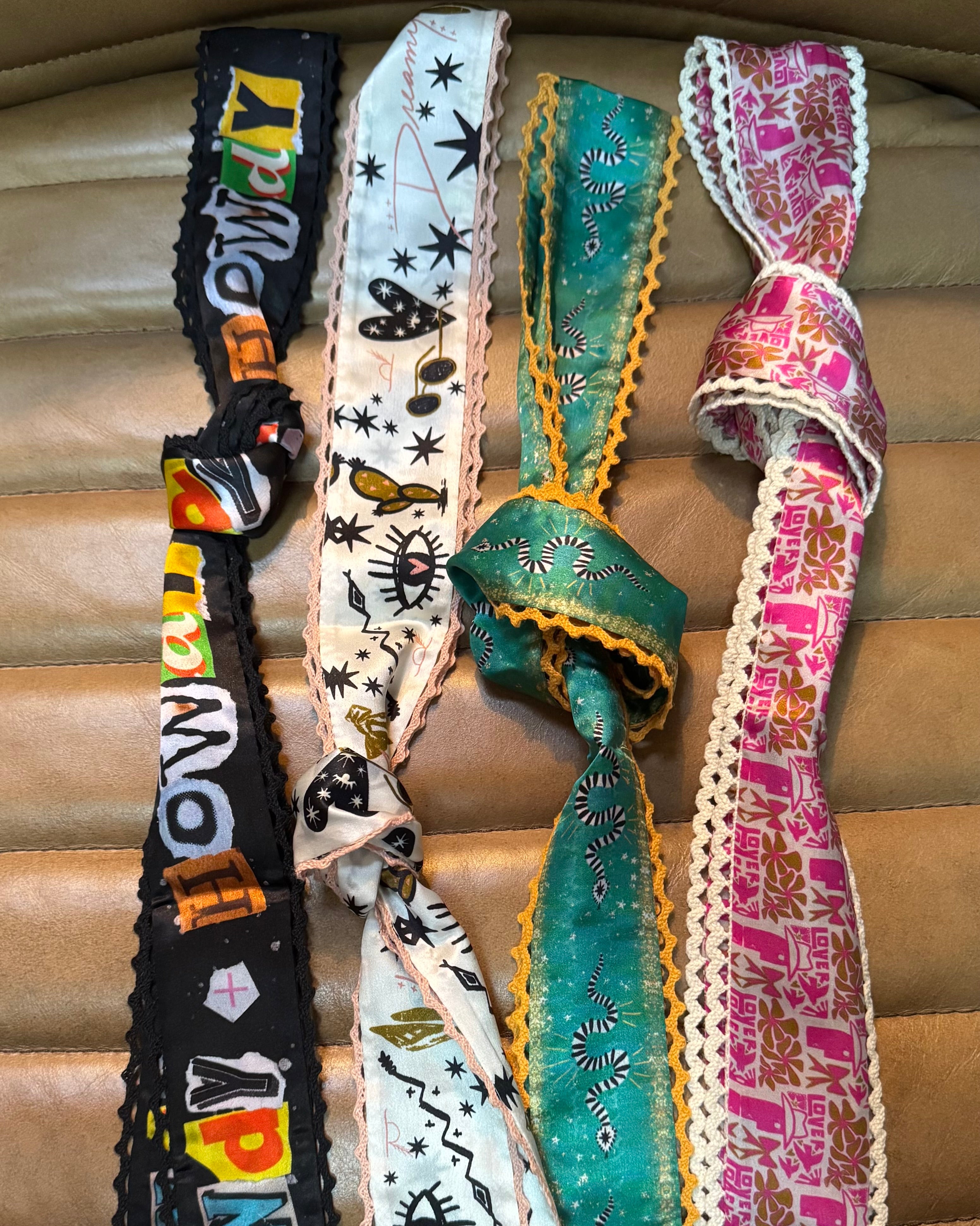 This silk twilly features custom designed artwork accompanied by a crochet trimmed edge by Allie Falcon herself, a southwestern artist known for her unconventional style. Each twilly highlights hand-drawn desert-inspired artworks and funkified western designs, capturing the essence of the cowboy world that surrounds Allie in her home state of Texas. The perfect addition to any bag!