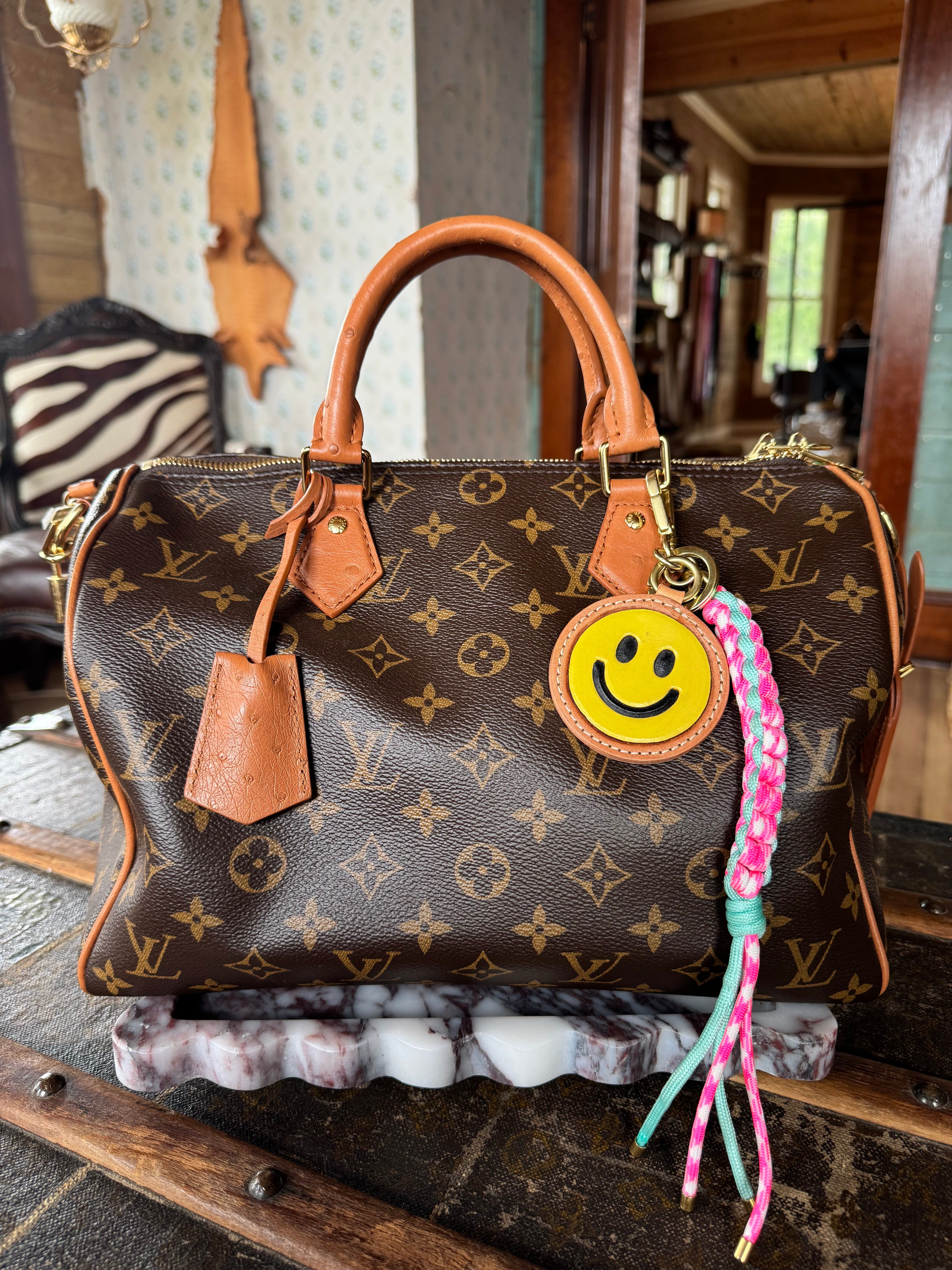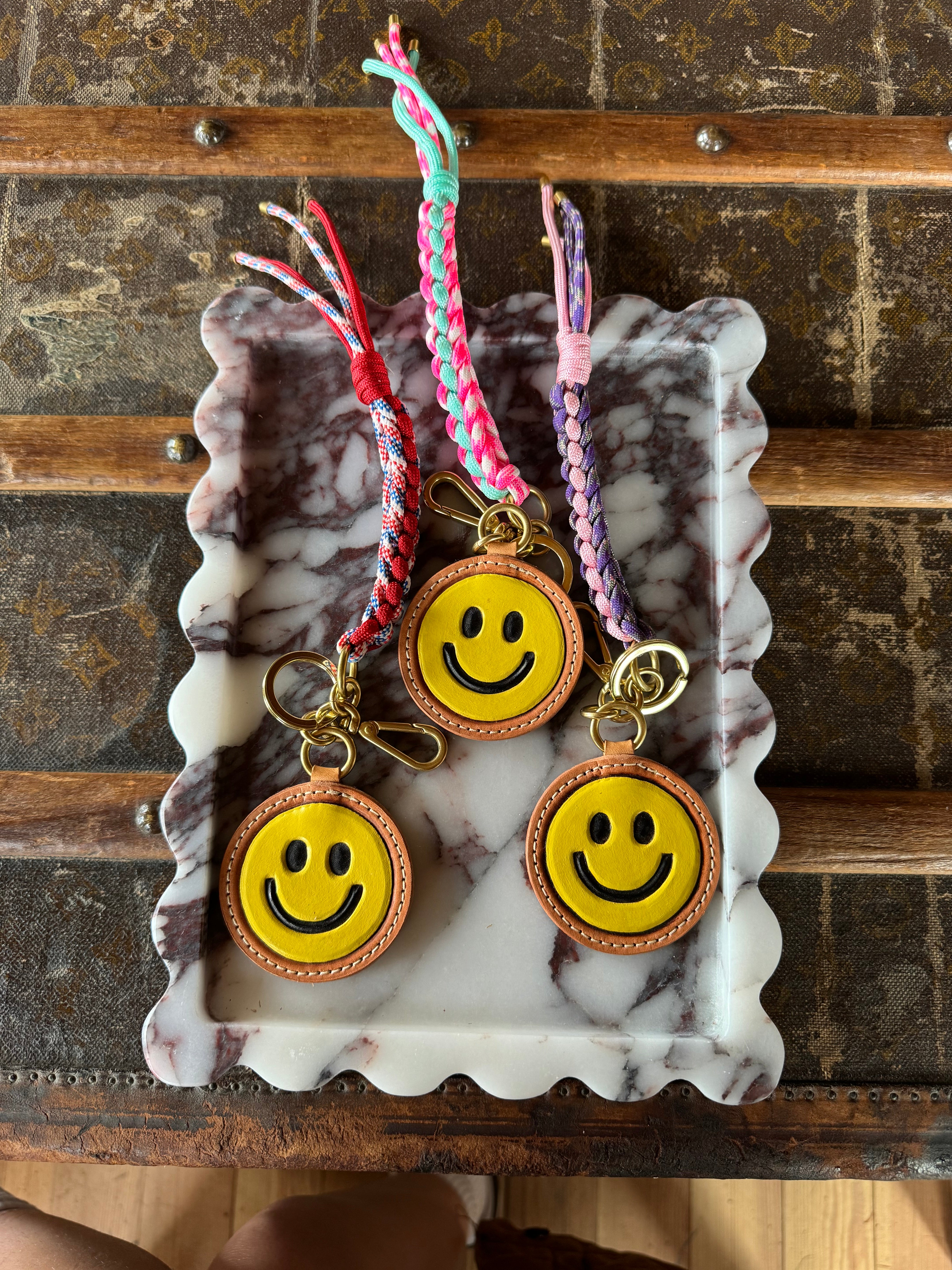 “Happy, Yes! Good Heart, Yes! Time for some fun color, always. Introducing my new purse charm. Two sided tooled leather, yummy paracord tassel with vivacious color, this is sure to supercharge your purse charm game. Approximately 11" drop from clip, this pretty is built to move and catch eyes at every moment.”