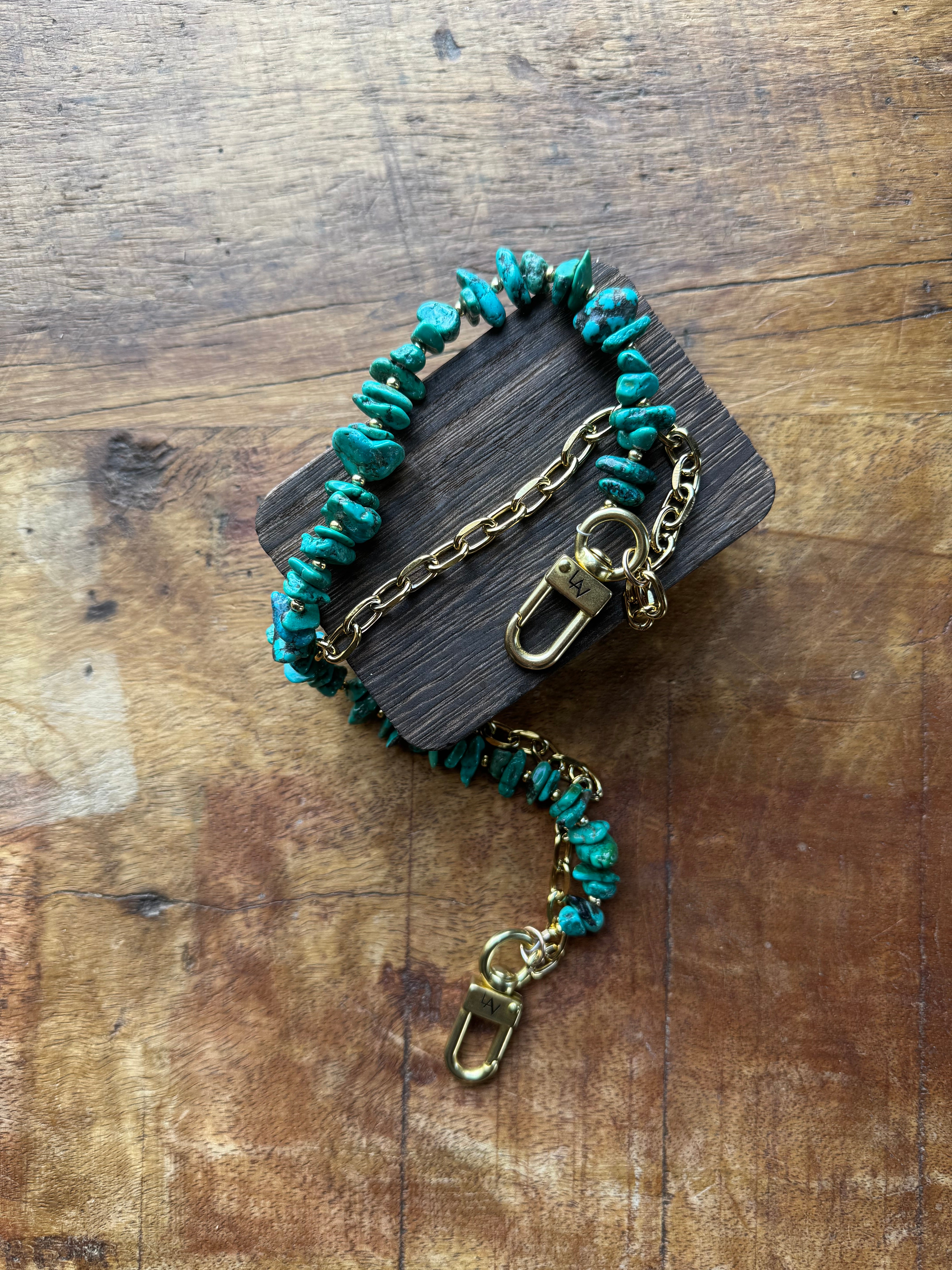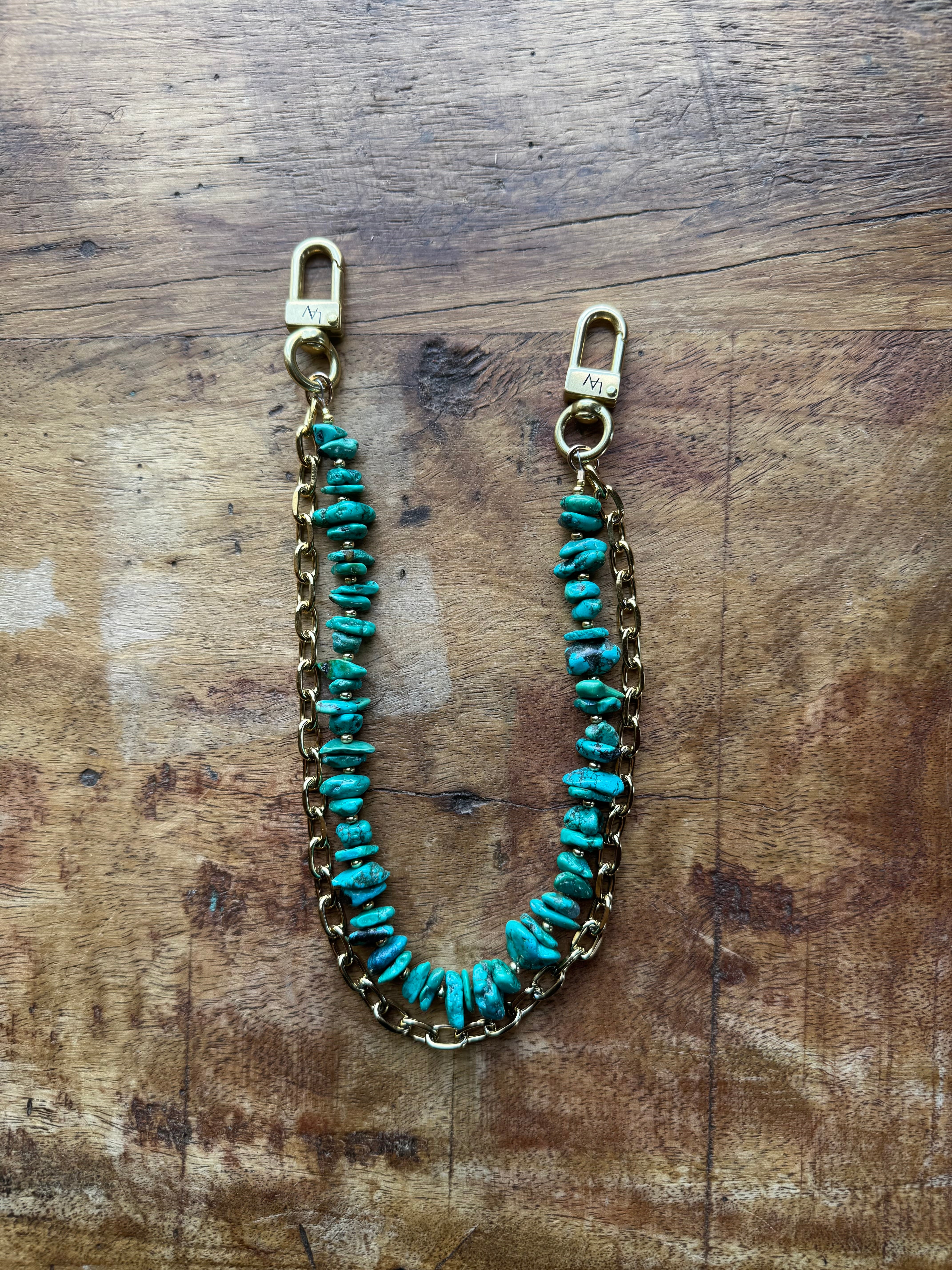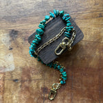 The chain accessory features a stunning strand of authentic funky shaped Kingman turquoise stones in an unusual texture attached to our solid brass snaps, offering a simple yet captivating look of natural charm. Measuring approximately 15 inches from clip end to clip end, it’s the perfect size to add a pop of color and texture to your favorite bag or to use as a strap.