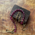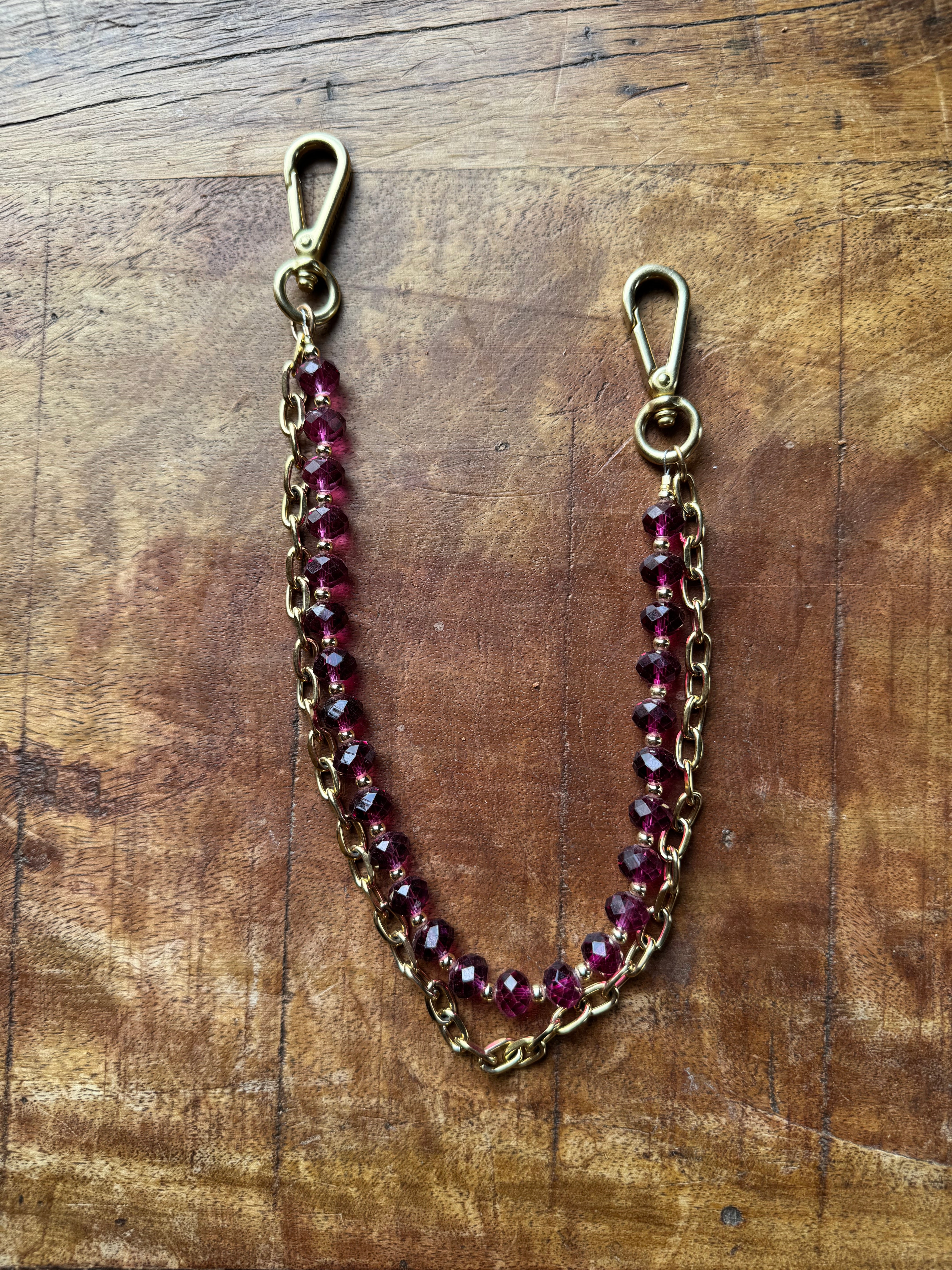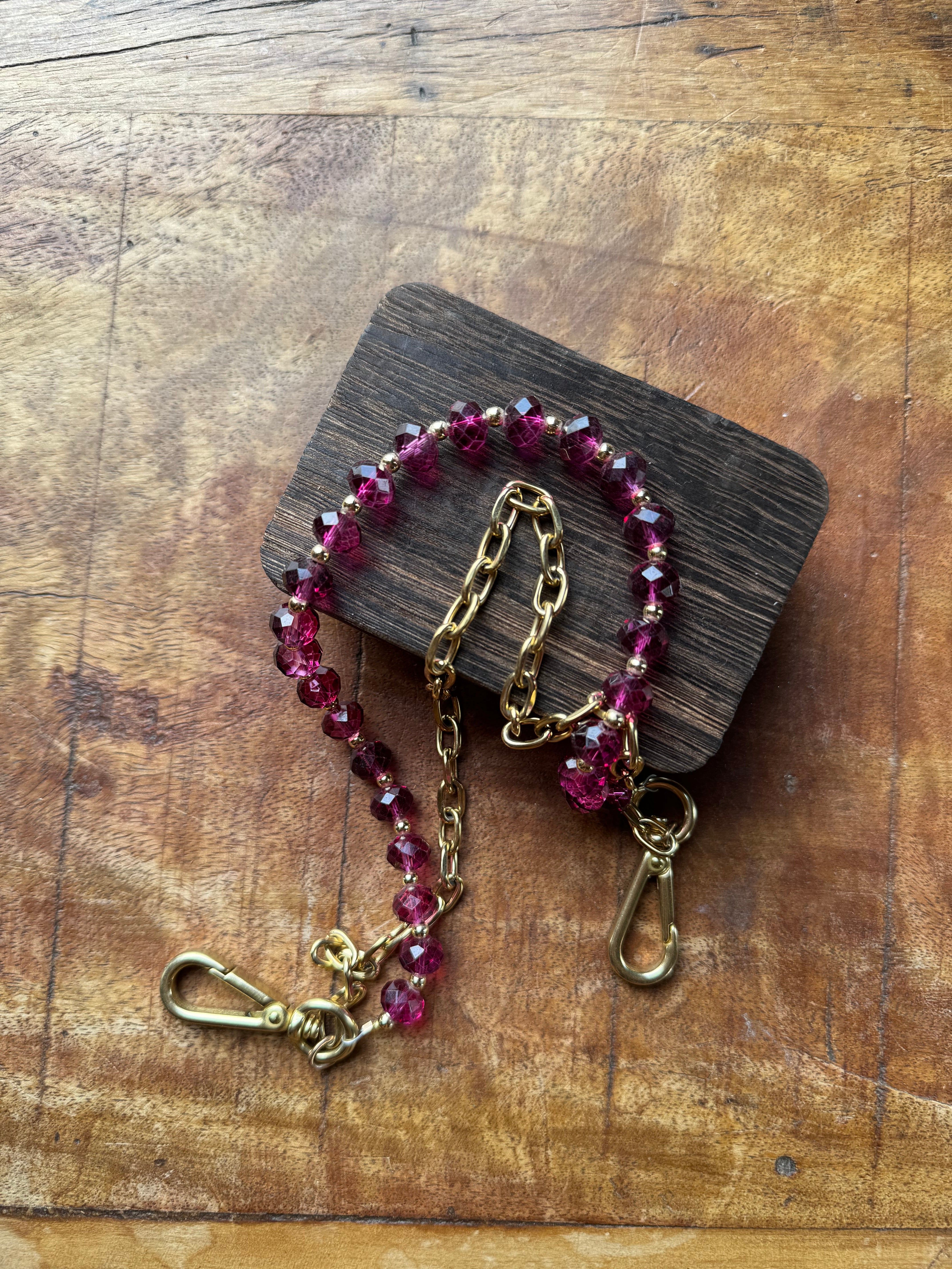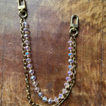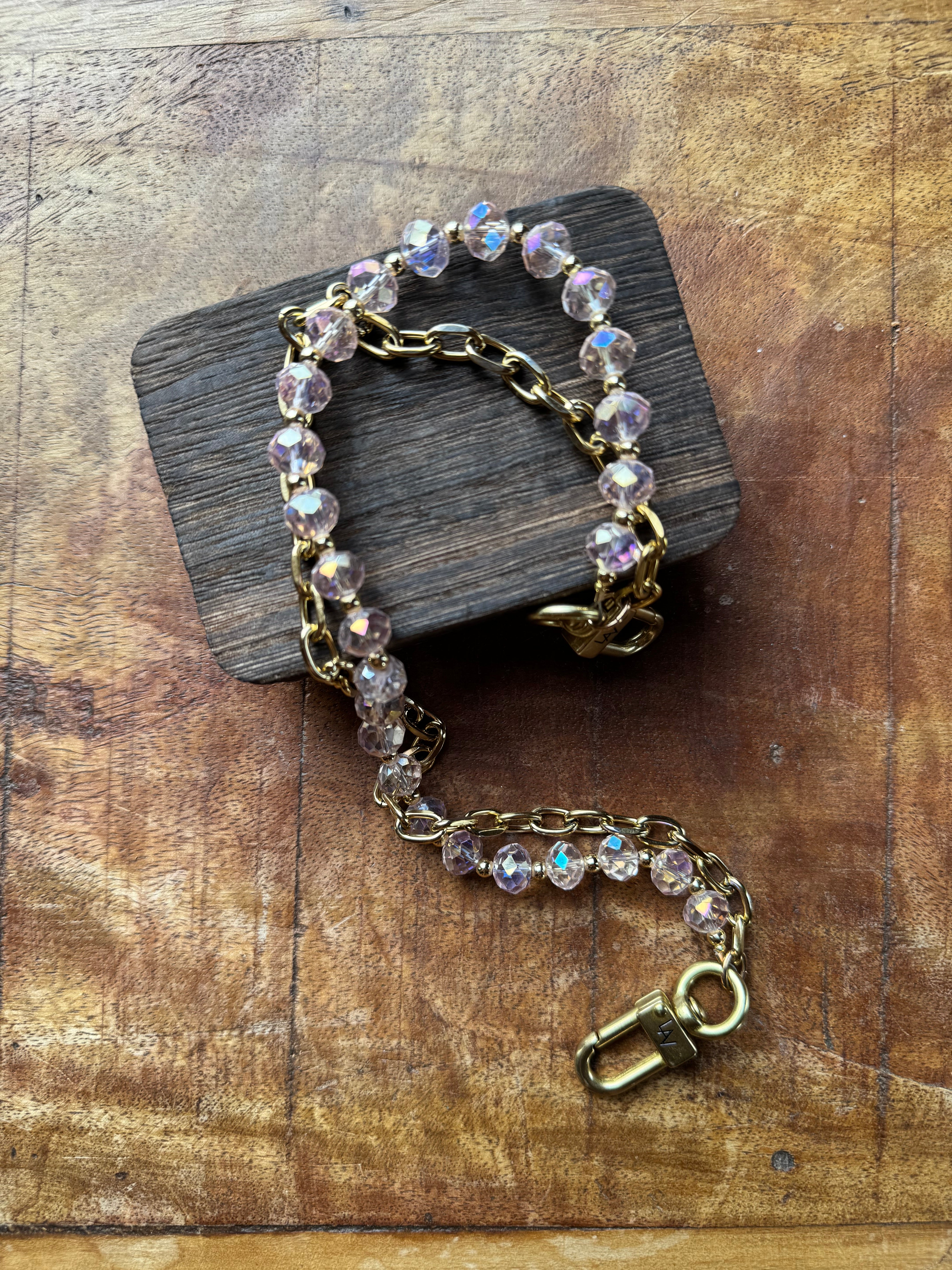 The chain accessory features a stunning mix of bright pink crystal beads with a faceted cut paired with a 14k gold-plated chain, creating a sleek and chic statement. Measuring approximately 15 inches from clip end to clip end, it’s the perfect size to add a pop of color and texture to your favorite bag or to use as a strap.