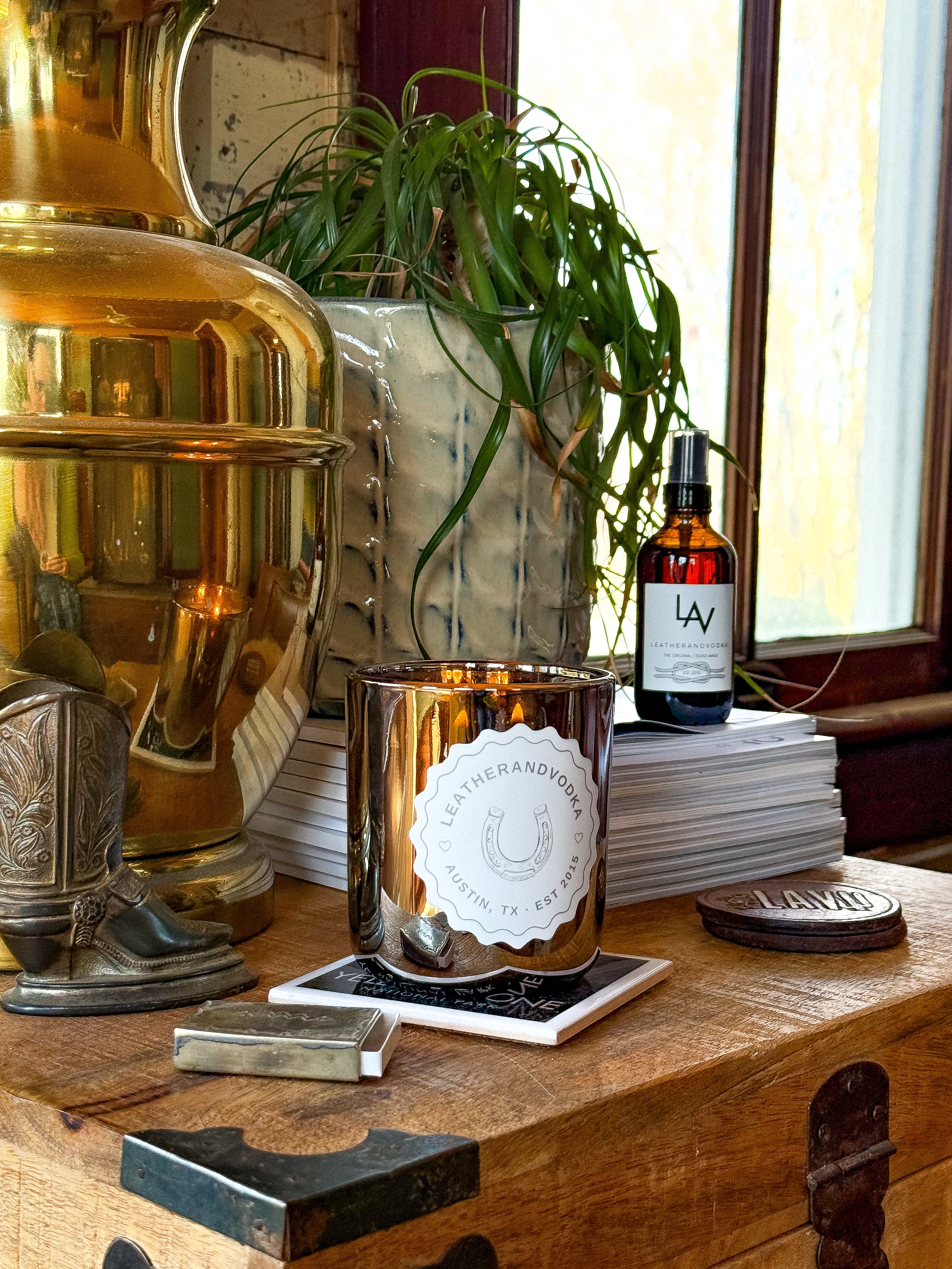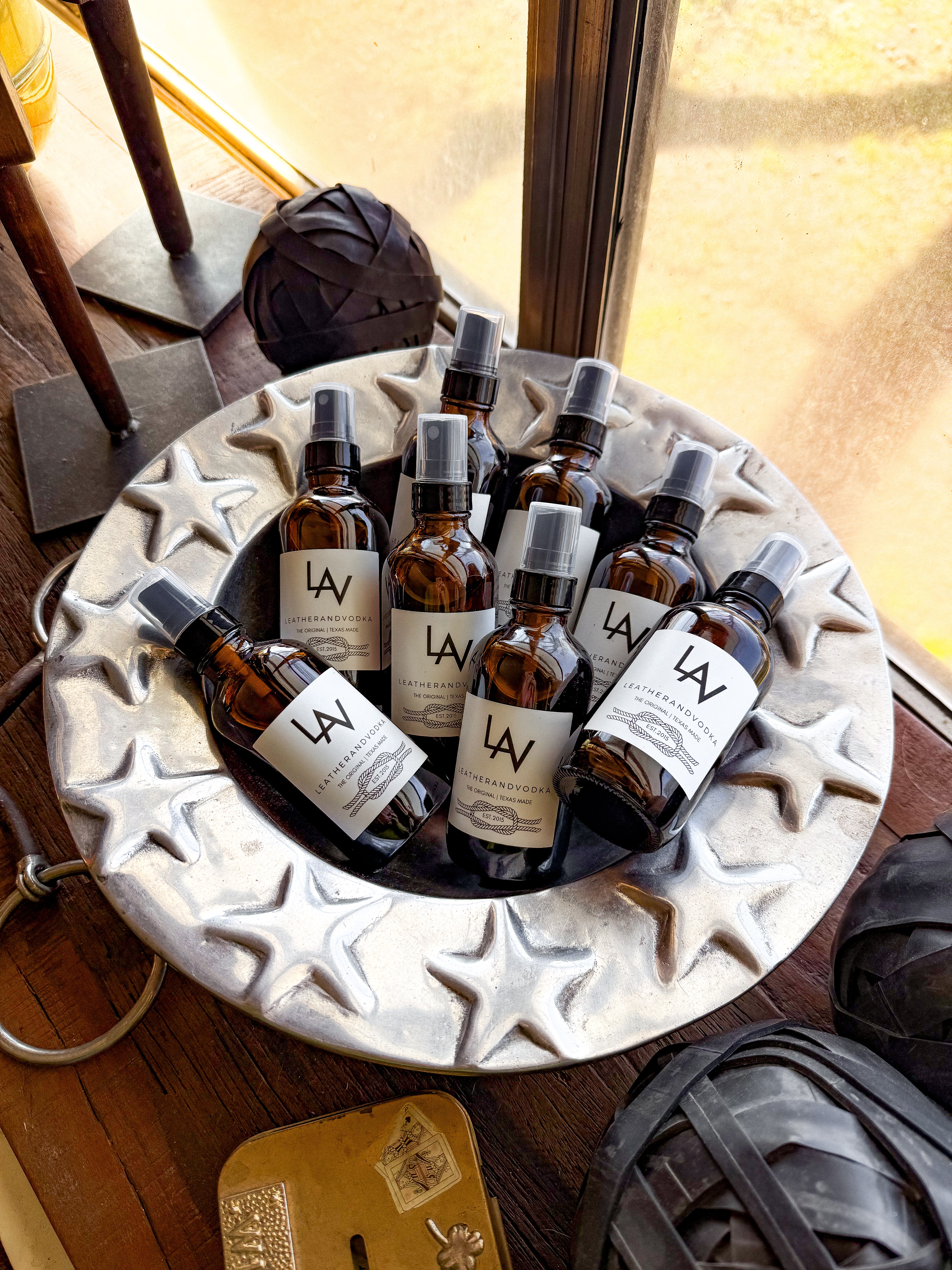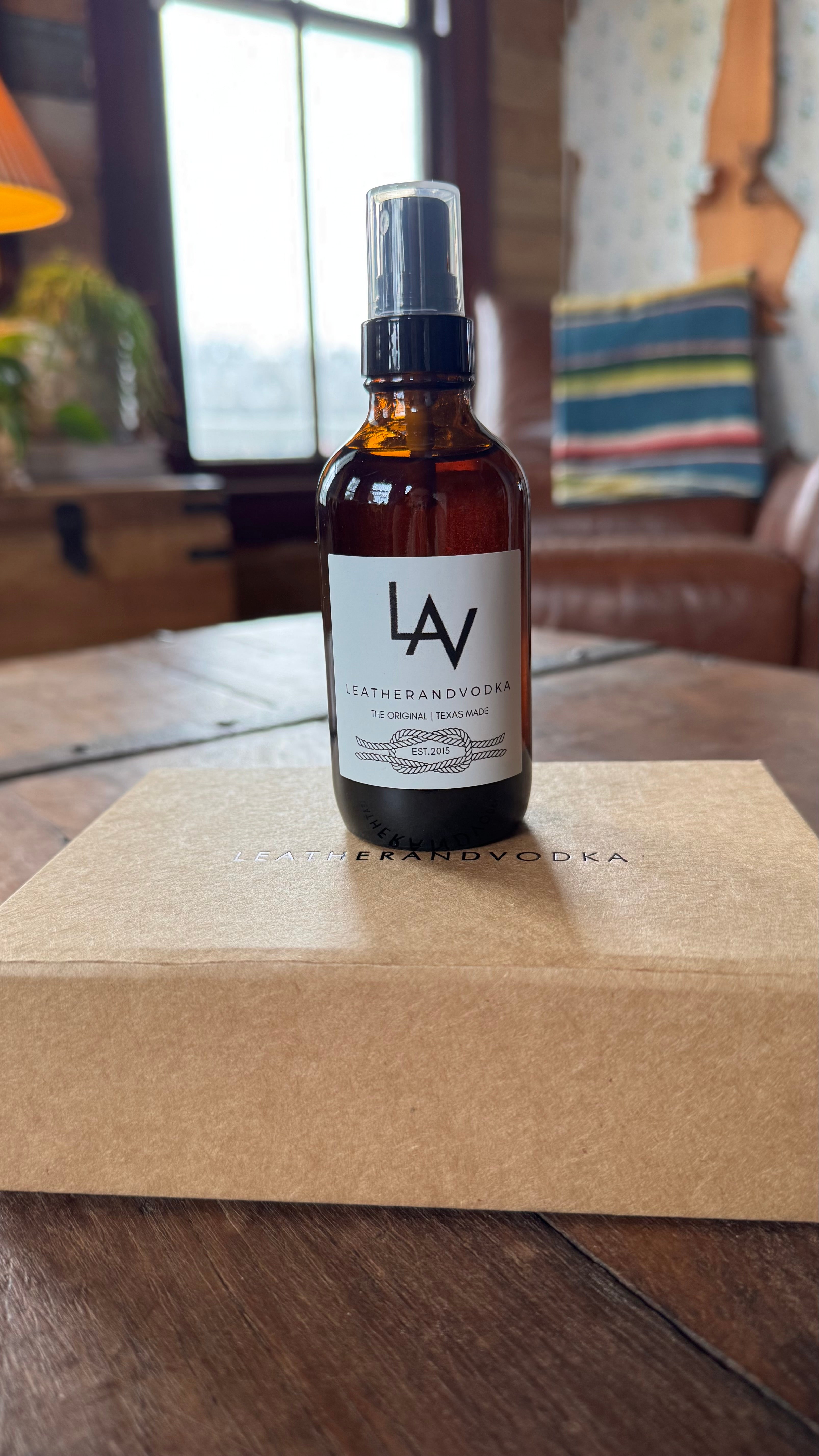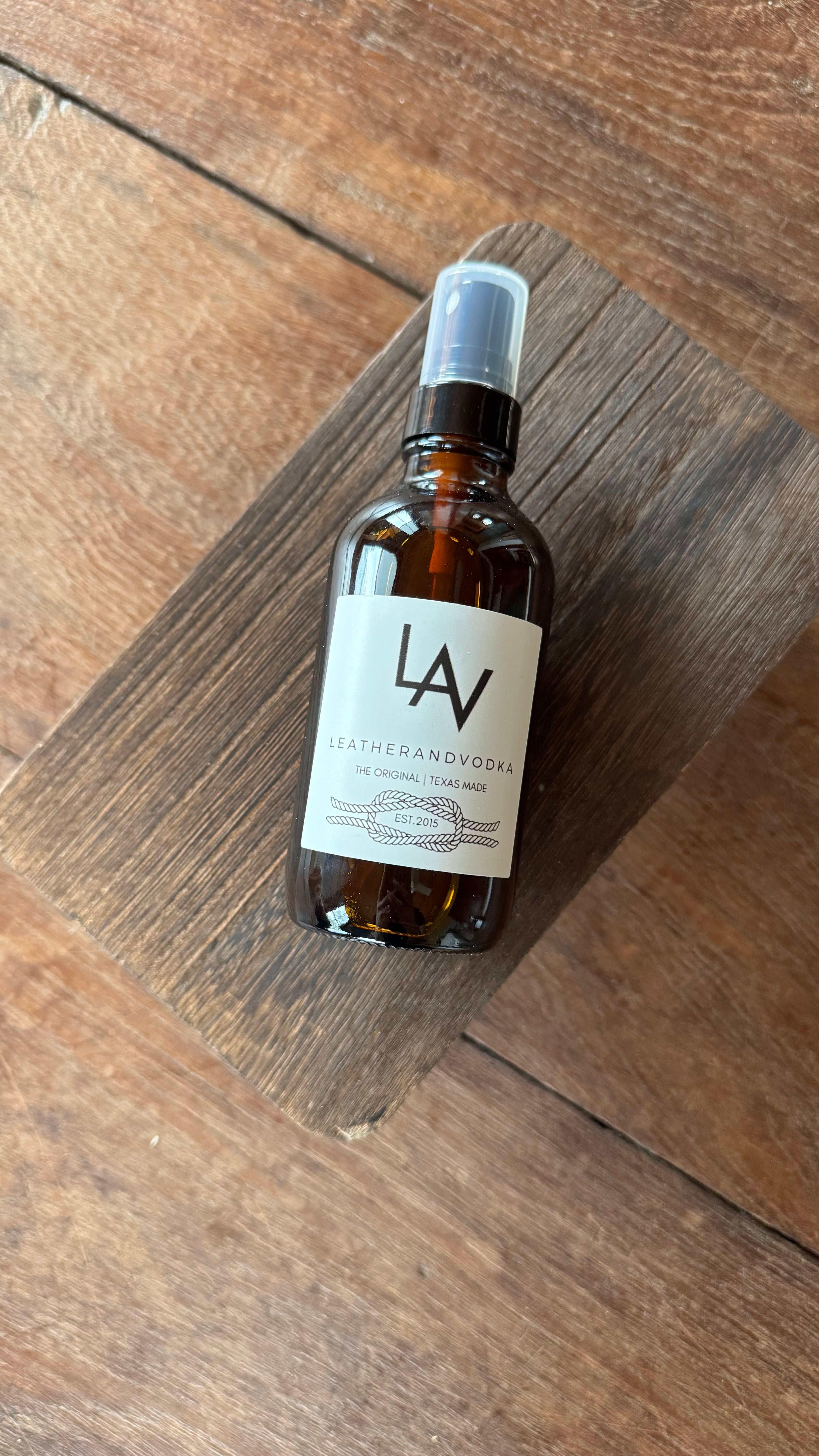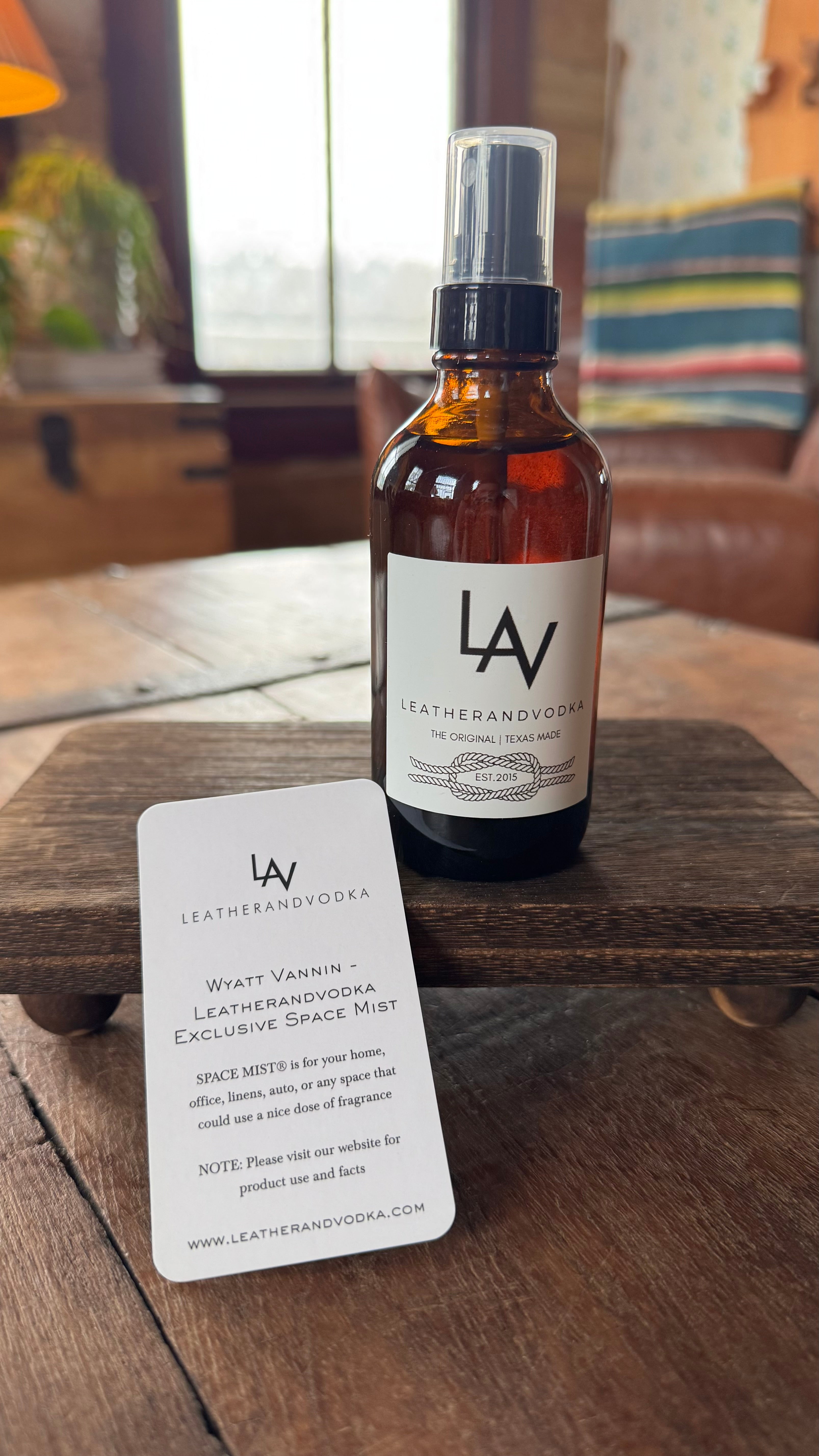 Wyatt Vaninn and Leatherandvodka Space Mist is a sensual fragrance blending the rich, warm notes of leather, teak, and bergamot. This sophisticated scent offers a deep, woodsy aroma that transforms any space with its inviting fragrance. The 4 fl oz. bottle measures 4.44" tall x 1.92" wide and is packaged in a reusable black Leatherandvodka sack for added luxury.