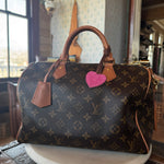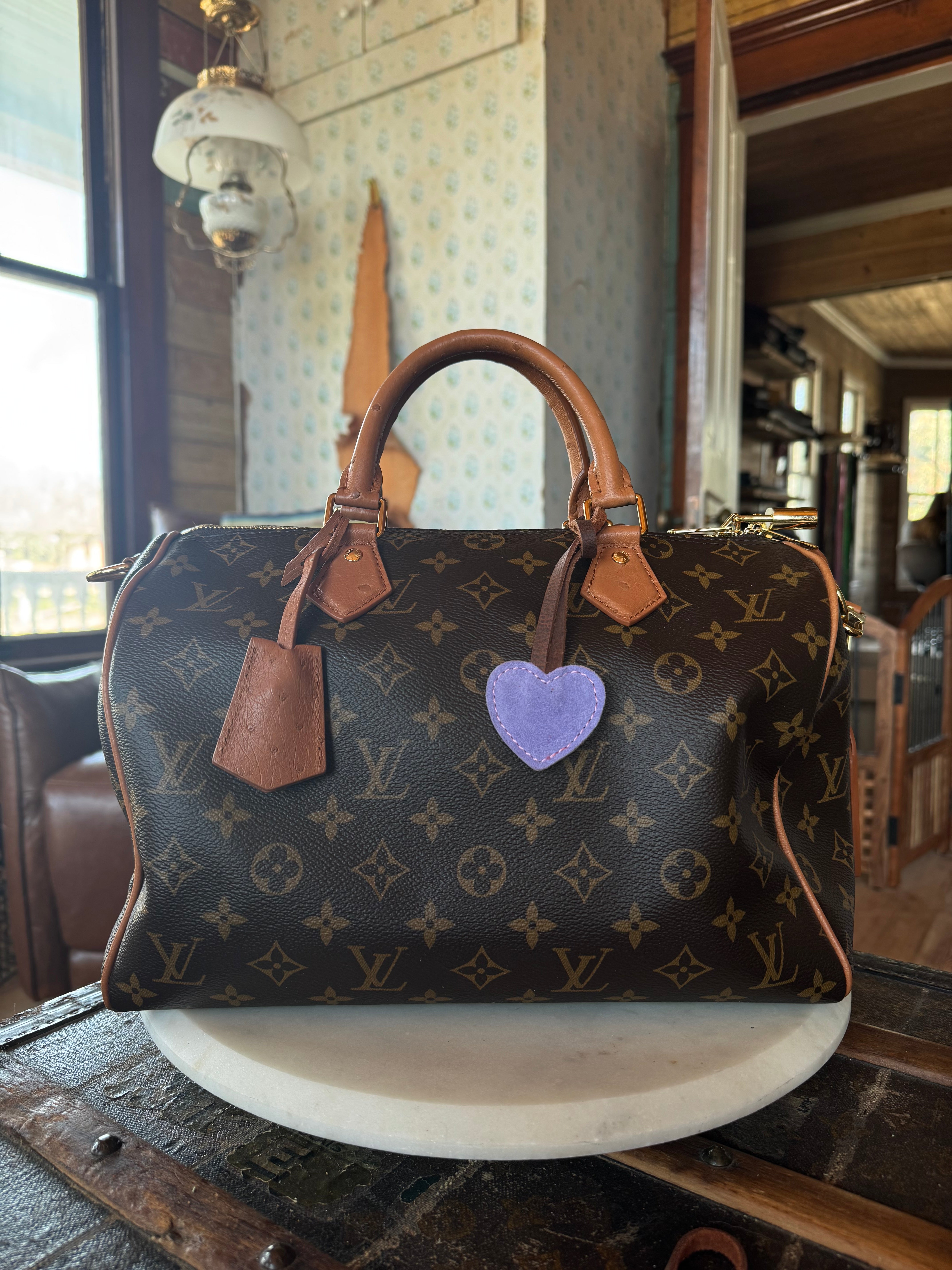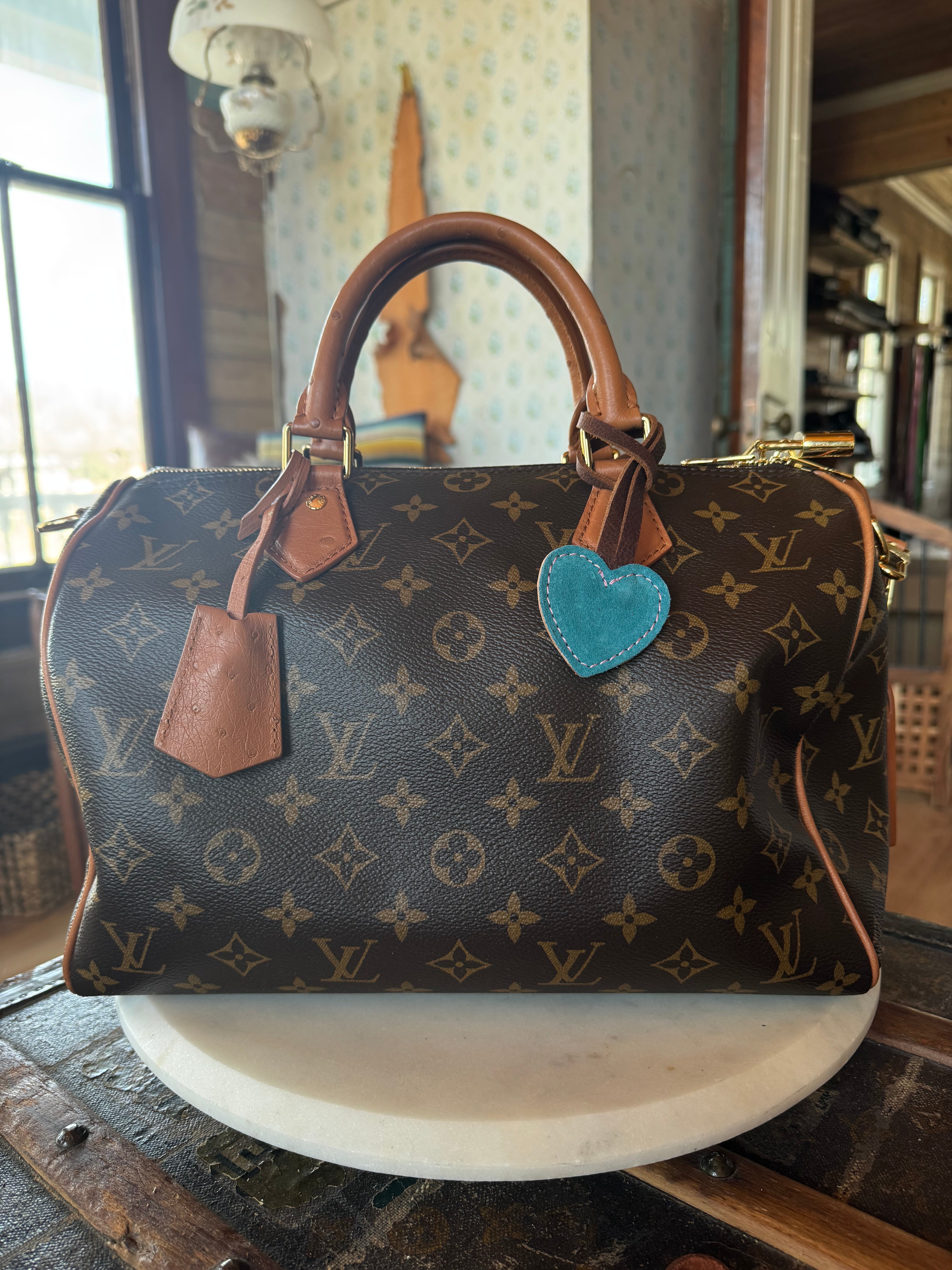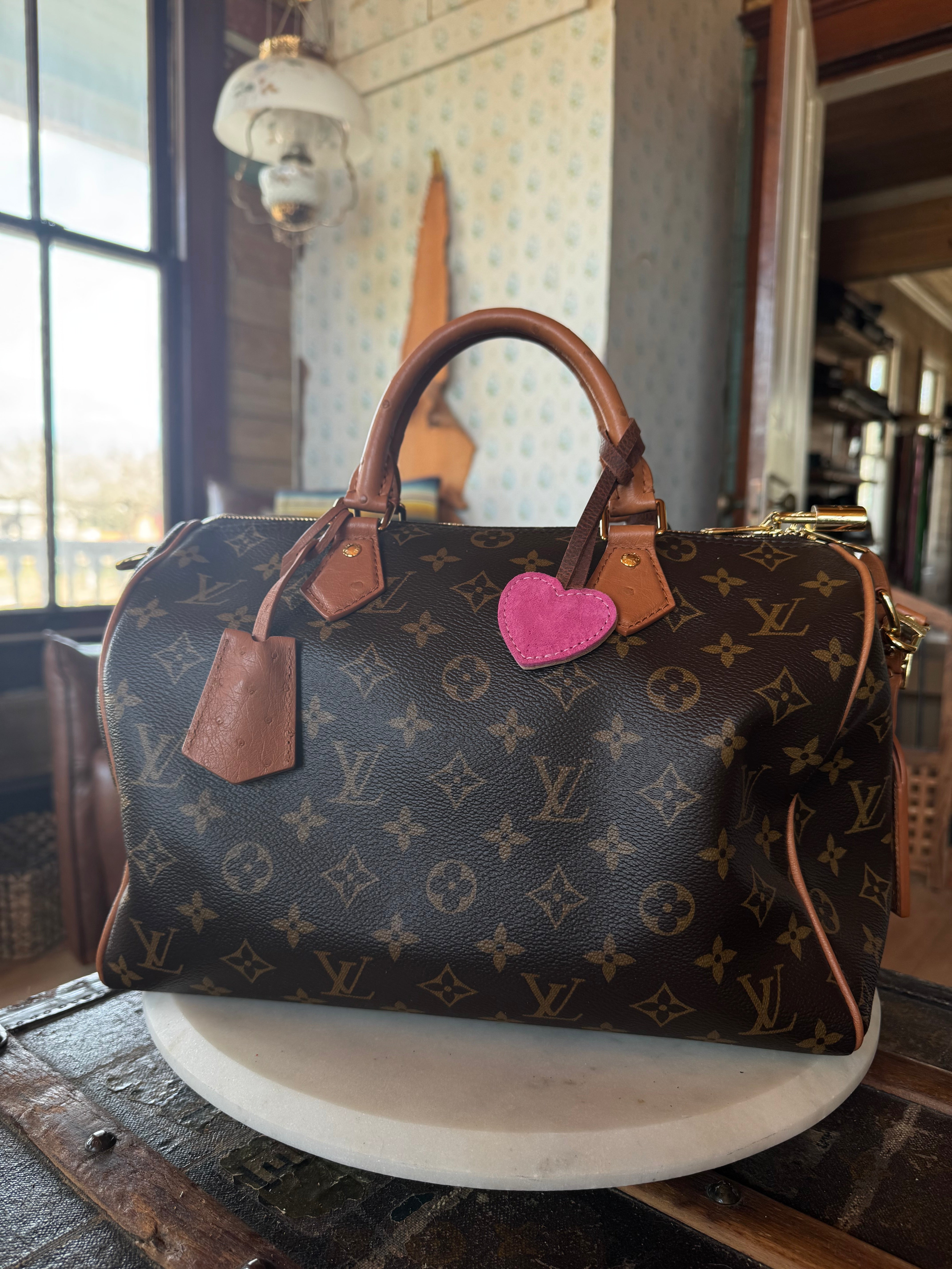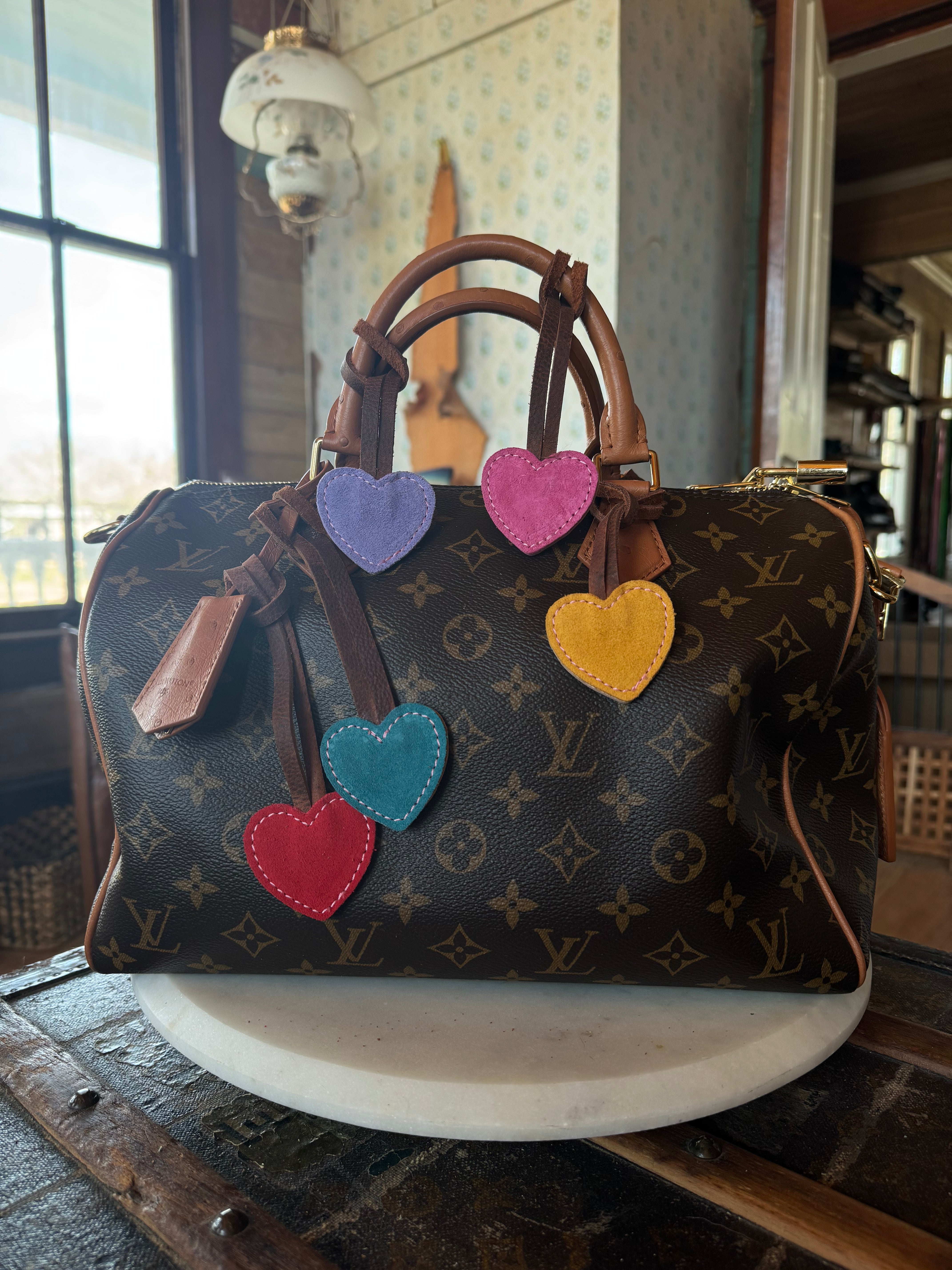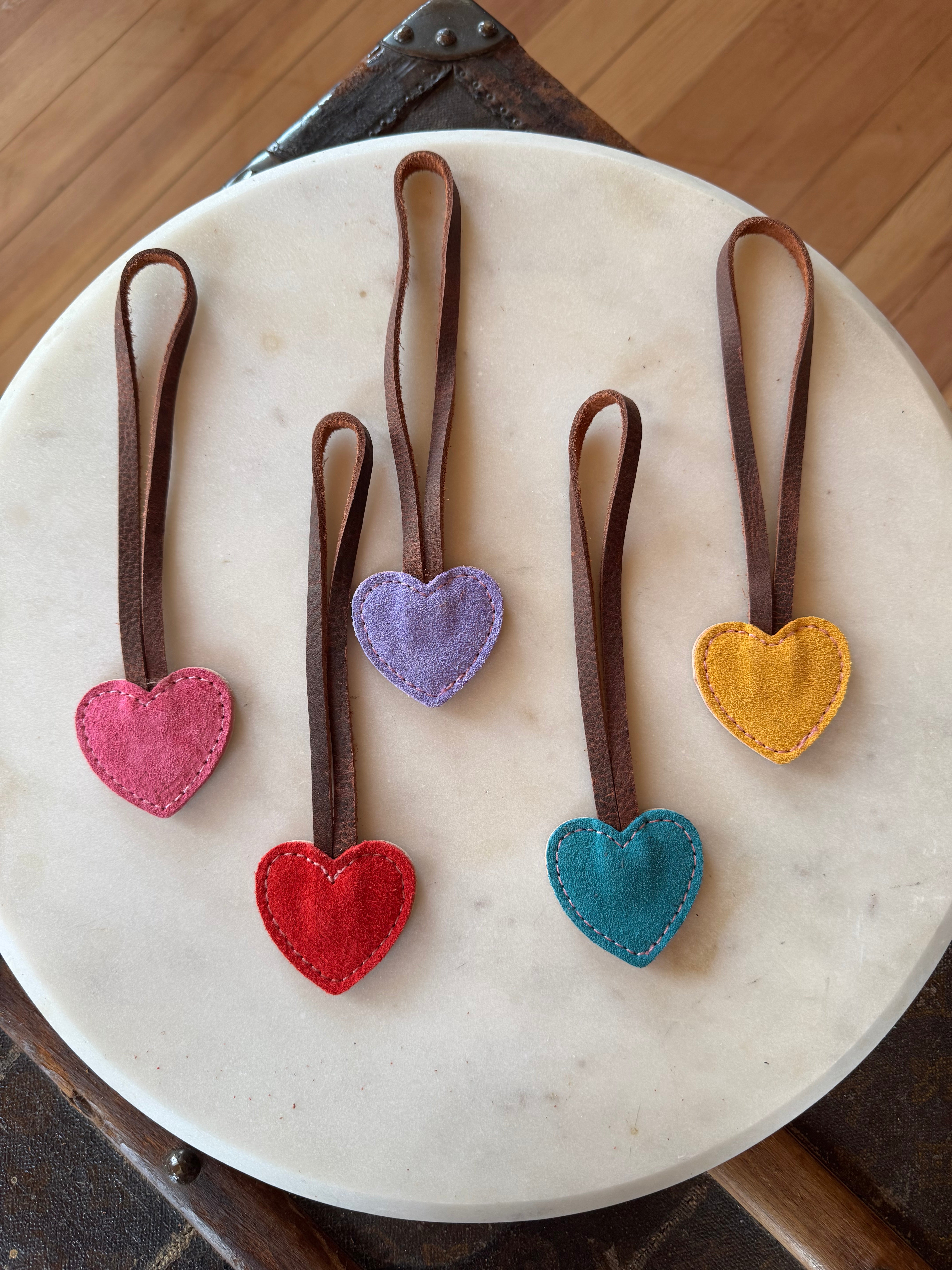 “Meet the Good Heart charm starter. Easily wraps around purse handles or can be looped through hardware. This sweet piece will give ya a good start! Made with fun color suede and accents with bubble gum pink thread.“