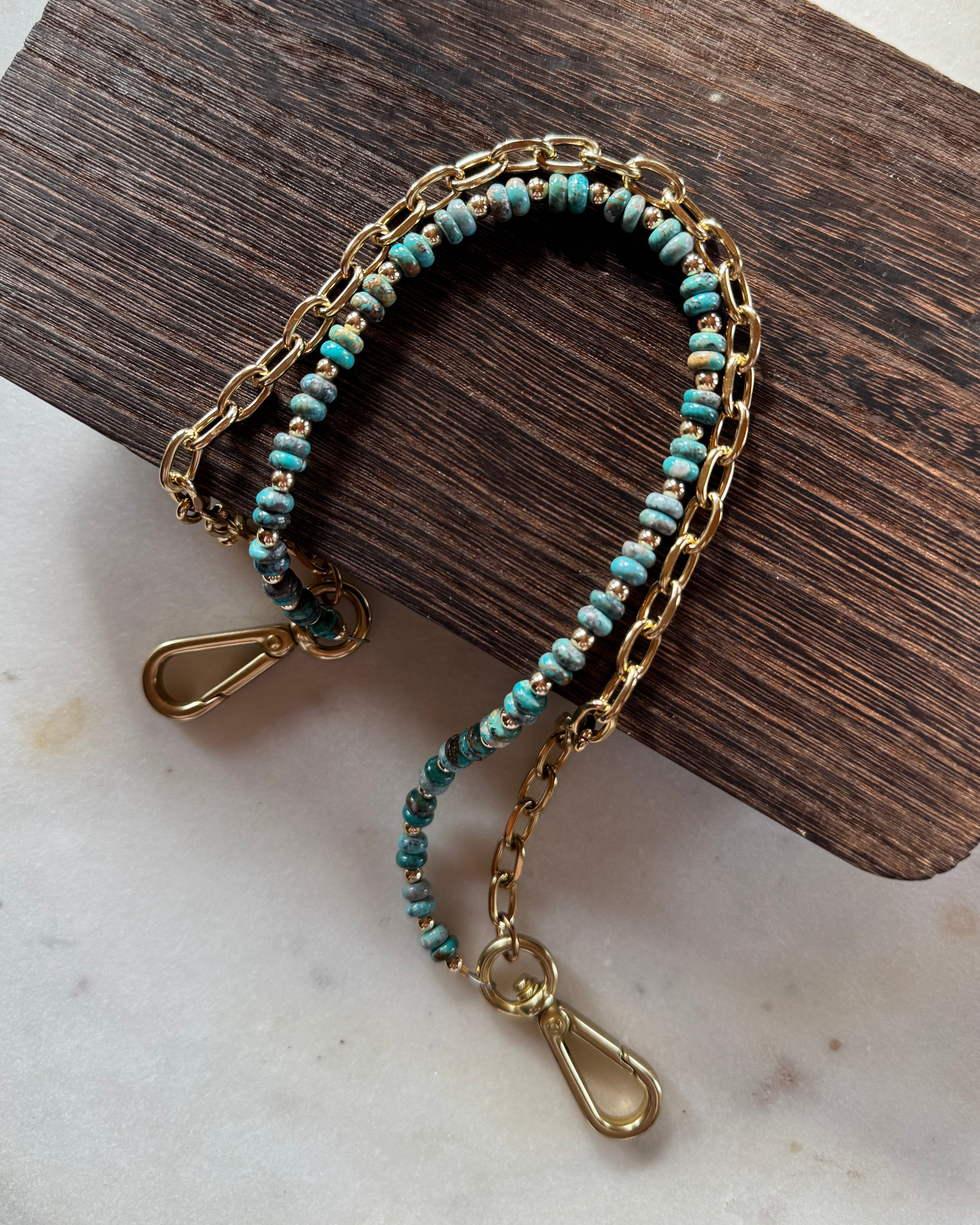 The chain accessory features a stunning mix of authentic Kingman beads with a 14k gold-plated chain, elevating your bag with luxurious detail. Measuring approximately 15 inches from clip end to clip end, it’s the perfect size to add a pop of color and texture to your favorite bag or to use as a strap.